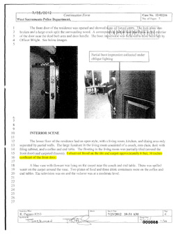 The CSI Report shows that the blood spatter is over 6 feet inside the home, not in the doorway where Wright says a struggle took place.